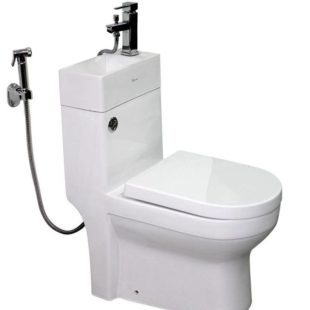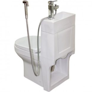 Par fonctionnalitéil y a des toilettes 2 en 1 combinant un lavabo et des toilettes, et les 3 en 1 sont en plus équipés douche hygiéniqueexécuter la fonctionnalité de bidet. Les modèles 2 en 1 sont uniquement connectés à une alimentation en eau froide, ce qui entraîne des inconvénients de fonctionnement. Vous devrez vous laver les mains avec de l'eau non chauffée. Les appareils équipés d'une fonction bidet peuvent être exempts de cet inconvénient. Il est important lors du choix de vérifier avec le vendeur ce moment. Puisqu'un mélangeur séparé peut être monté sur une douche hygiénique, monté sur un mur ou intégré dans la poignée d'un pulvérisateur, ou avoir un mélangeur commun pour un lavabo et un bidet. Cela vous permettra d'utiliser de l'eau chaude pour vous laver les mains.- Il existe également des modèles statiques avec des pièces dynamiques. Deuxièmement, le lavabo sert de couvercle pour la cuvette et pour utiliser les toilettes, vous devez déplacer l'évier sur le côté. Une fois terminé, retournez à l'endroit et rincez. Lors du choix d'un appareil de plomberie avec pièces tournantes, une attention particulière doit être portée aux mécanismes responsables du mouvement. Ils doivent être de haute qualité et durables, car ils seront sûrement les premiers à échouer.