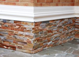 - Dans le même plan que le mur. Si, après parement, le socle et le mur sont dans le même plan, l'installation des marées n'est pas nécessaire, mais dans ce cas matériau de revêtement de plinthe doit être isolant. La pierre naturelle, la céramique ou les mélanges de finition spéciaux aux propriétés calculées conviennent bien. Des mesures supplémentaires sont le frottis isolementfabriqué avec des solutions à base de bitume ou de résines acryliques.