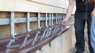 - La chute. Le sous-sol du bâtiment est plus fin que le mur, ce qui permet de former un auvent particulier. Dans le cas où, après le revêtement final, le rebord est supérieur ou égal à 5 cm, une étanchéité supplémentaire des surfaces aux influences atmosphériques et au dispositif de coulée n'est pas requise. L'humidité qui s'écoule des murs n'atteint pas le sous-sol en quantité suffisante pour les processus négatifs.