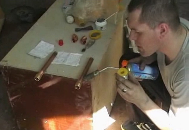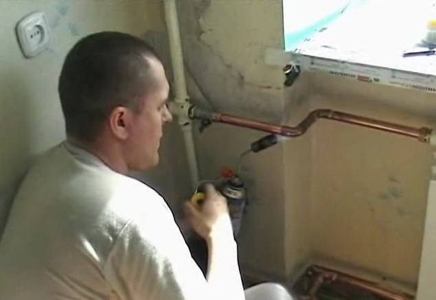 S'il y a des tuyaux en cuivre, vissez les raccords juste pour essayer, puis dévissez-les. Mesurer la longueur de tuyau souhaitée sur le raccord pivotant. Prenez le tuyau et coupez la pièce souhaitée. Après cela, nous nettoyons les bords avec le même broyeur. Placez-le couché et enfoncez l'extrémité du tube dans un cercle rotatif. Préparez un chalumeau. Il est conseillé avec une extrémité étroite de la flamme, mais ceux-ci sont un peu plus chers, donc s'il n'y a pas de possibilité, vous pouvez faire le plus simple pour 150-200 roubles. Préparez la soudure. Souder le raccord adaptateur (du câblage de la colonne montante) au tube séparément, puis visser le raccord avec le tube en place. Si vous faites le contraire, il y a un risque de brûler la valve du robinet à boisseau sphérique.