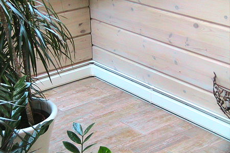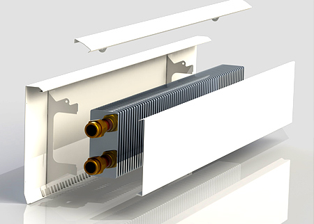 Type d'eau se compose de pièces telles qu'un bloc de radiateur, une pièce de collecteur et des tubes en plastique. Le principe de fonctionnement est basé sur la loi de la physique sur l'attraction d'un flux d'air vers les surfaces proches. L'air est chauffé dans le radiateur du socle de manière convective. Il va dans la fente en bas plinthes, s'échauffe et sort par la fente supérieure, montant le long du mur. Ainsi, quelque temps après avoir allumé le chauffage, vous obtiendrez des murs chauffés, qui eux-mêmes rayonneront de la chaleur dans la pièce.