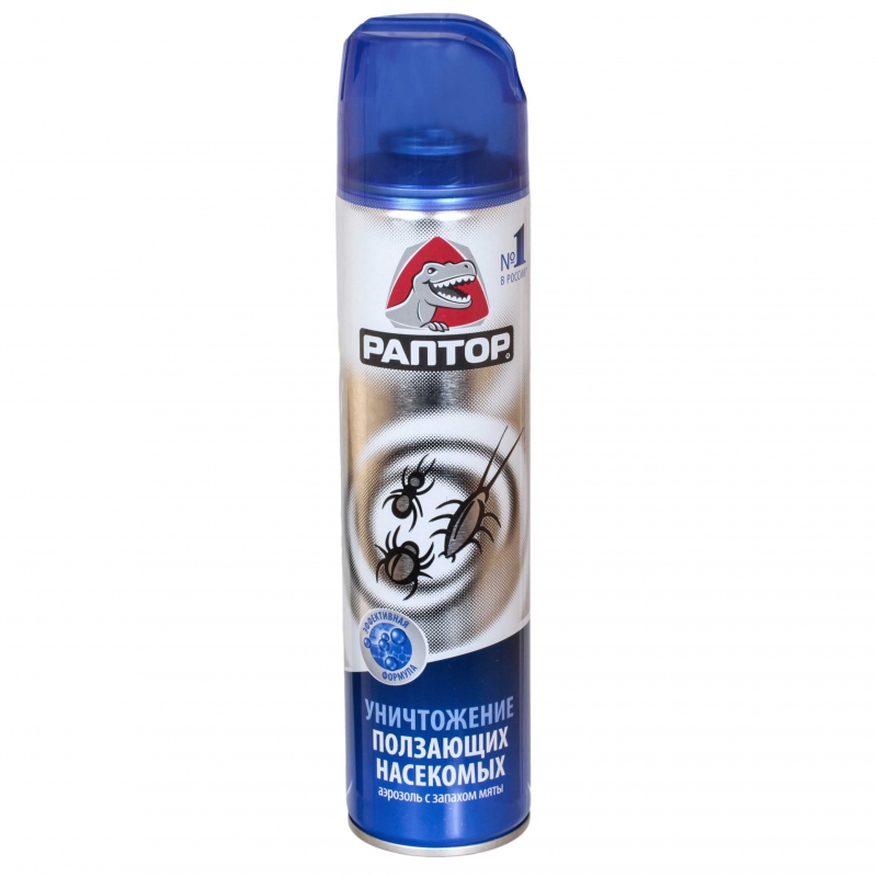 Aérosol "Raptor". Conçu pour les insectes rampants. Le produit a une odeur de menthe et est capable de détruire une grande variété de parasites et de parasites, ainsi que des araignées. L'action de l'aérosol après traitement de l'habitation est assez longue - 3 mois. Une pulvérisation de ce produit suffit pour une pièce d'une superficie totale de 60 m². Classe de danger 3.