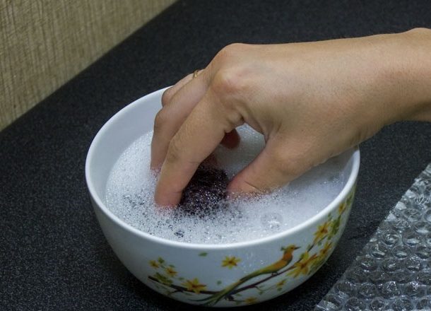 - Mýdlo na praní - pomůže vyrovnat se se žloutnutím, pokud je příčinou jeho vzniku mastný plak. Polovina tyče by měla být nastrouhána na hrubém struhadle. Vylijte hobliny mýdla teplou vodou a nechte je zcela rozpustit, občas za stálého míchání. Mělo by se to ukázat jako poměrně silná kaše. Musí se nanést na houbu a pečlivě otřít zažloutlé oblasti. Pro dosažení lepšího účinku je zbývající kaše rovnoměrně rozložena do problémových oblastí a ponechána působit po dobu 30 minut. Poté se povrch znovu otře houbou, promyje se čistou vodou a setře se do sucha;