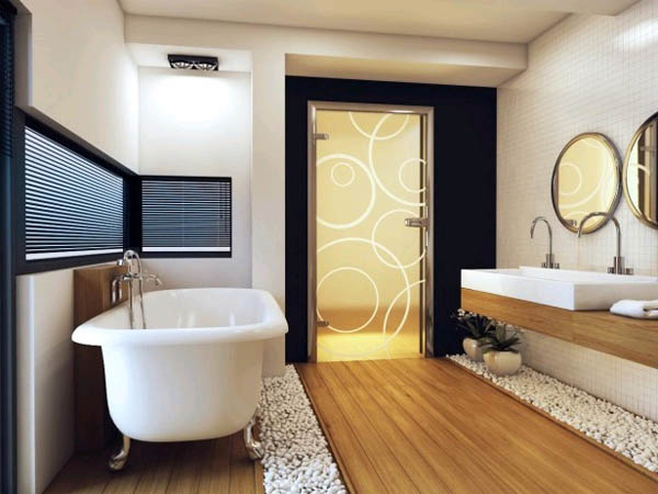 Pro koupelny a toalety nejlepší volbou je instalace takových dveří, které budou odolné vůči zvýšené vlhkosti a vlhkosti a budou mít také vysoké izolační vlastnosti proti hluku. V těchto místnostech můžete instalovat skleněné dveře s matným efektem. Takové sklo má několik stupňů průhlednosti a proto, aby se snížila průsvitnost stínů přítomných v místnosti, je nutné zvolit hustší produkty. Za tímto účelem jsou taková skla vyráběna v průmyslu, který nesvítí a neodráží světlo ani stín.