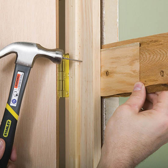 Než začnete instalovat zárubeň dveří, musíte zkontrolovat rovnost povrchu stěn. Pokud je povrch nerovný, pak určitě je třeba ji zarovnat. Poté nainstalujte rám dveří. Pomocí dřevěných klínů opravit krabici. Opět se uchýlíme k hladině a zkontrolujeme povrch krabice s ní. Je-li zjištěna nejmenší drsnost, je nutné situaci napravit, jinak po instalaci plátna na závěsy se dveře nebudou moci úplně zavřít. Krabice je opravena pomocí kladiva a sekáče.