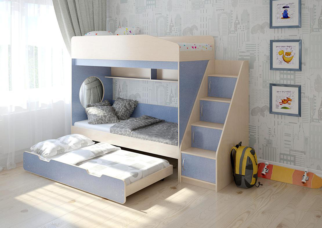 Si les enfants d'âges différents, il faut partir de la règle de sécurité, aux niveaux supérieurs il n'est pas recommandé d'avoir des enfants de moins de 5 ans. Dans le cas où les trois enfants d'âge préscolaire l'âge, il vaut la peine d'acheter un lit avec un système coulissant. Ainsi, le niveau supérieur sera à une hauteur assez sûre.