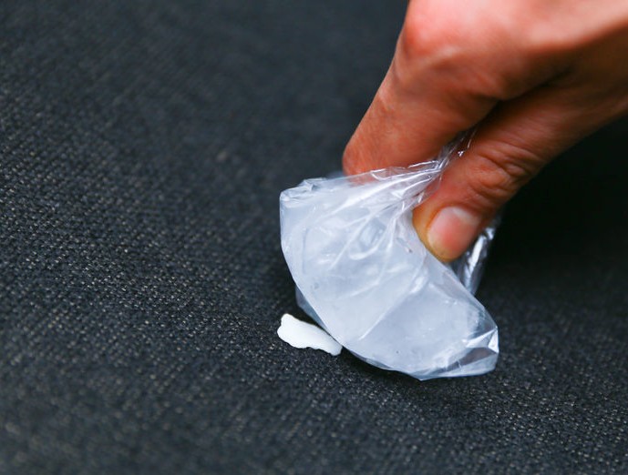 Si du chewing-gum s'est accroché aux meubles rembourrés, il peut facilement être gratté avec un couteau si vous les avez préalablement congelés. Pour ce faire, placez de la glace enveloppée dans un sac en plastique dessus. S'il reste une trace après cette opération, essuyez-la avec de l'acétone.