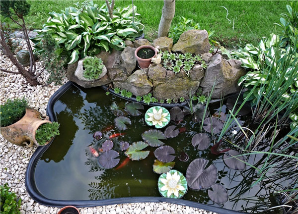 - Da der Teich nicht zum Schwimmen, sondern zu Dekorationszwecken verwendet wird, ist keine große Lichtmenge erforderlich, die zur Erwärmung des Wassers beitragen würde. Im Gegenteil, Sie sollten versuchen, einen Ort zu wählen, an dem die Sonne die Wasseroberfläche entweder erst morgens oder nach dem Abendessen beleuchtet. Bei konstanter Beleuchtung wird die Wassertemperatur sehr hoch sein und alles Leben darin wird einfach zugrunde gehen.