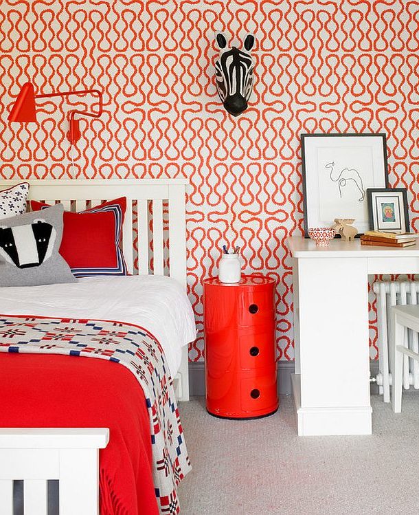 - In Kinder Räume, in denen solche Tapeten verwendet werden, um den Raum auf einfache Weise in Zonen zu unterteilen. Ein Ort für Spiele kann lebendiger und dynamischer sein. Der Ruhebereich sollte neutral sein und ein mittelgroßes Muster aufweisen, um die Psyche des Kindes nicht zu reizen und keine unfreiwillige Konzentration von Aufmerksamkeit und Anstrengung zu verursachen. Das Muster sollte klein und nicht häufig sein;