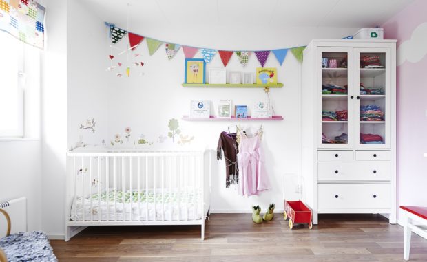 Die weiße Farbe bleibt der Hintergrund, aber im Gegensatz zu anderen Räumen werden im Kinderzimmer hellere Farben verwendet, und 1-2 helle Farben sind in diesem Fall nicht beschränkt. Der Rest der Regeln bleibt unverändert: viel Licht, Holz oder Korkbodenleichte Wände. Tapete mit dem Bild von Schiffen wird angemessen sein, an den Wänden können Sie die Konturen von Gebäuden charakteristisch für skandinavische Städte zeichnen. Oft sind Kinder mit Fahnen und gestreiften Teppichen geschmückt.