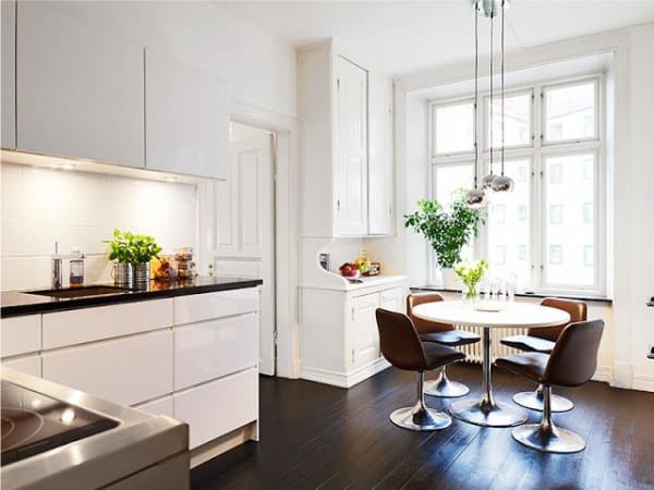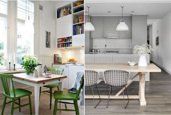 Wenn für den Arbeitsbereich eine Holzarbeitsplatte gewählt ist, dann Esstisch Kann mit einer Tischplatte aus dem gleichen Holz genommen werden. Ein Holztisch ist jedoch ein Klassiker des skandinavischen Stils. Sie können die Küche mit hellen Stühlen beleben. Die Technik ist besser einzubauen. Vergessen Sie nicht die Fülle des künstlichen Lichts, und Sie können die Fenster verlassen überhaupt keine Vorhänge oder verwenden Sie Jalousien.