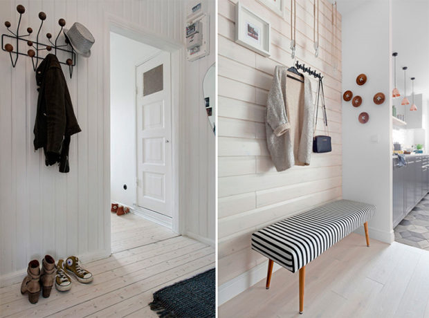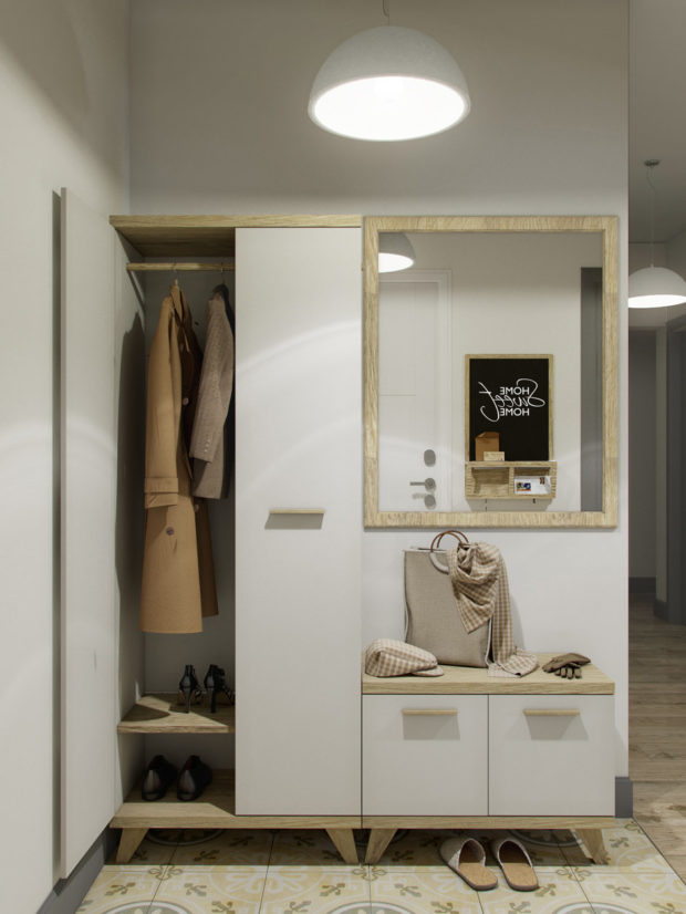 Die Hauptkomponenten in diesem Fall werden sein großer Spiegel und bequemes Speichersystem. Verzichten Sie in der Regel mit dem System auf einen Schrank Kleiderbügel und Schuhregal. Wenn Sie keinen Schrank haben, nehmen Sie ein weiß lackiertes oder lackiertes Holz.