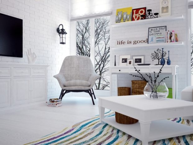 Skandinavischer Stil ist Vormachtstellung weißsowie eine Fülle Pastelltöneeinschließlich hellgrau, hellgrün, hellblau, hellbraun, beige. Es fällt natürlich aus, sehr leicht und entspannend, aber irgendwie langweilig. Wir erinnern uns, dass der Innenraum bequem und nicht langweilig sein sollte Helle Farbflecken sind willkommen.
