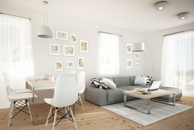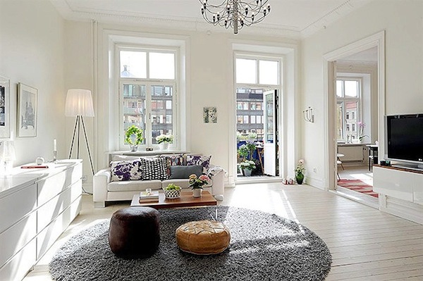 - viel Licht und Freiflächen. Lange Winter und ein Mangel an Sonnenlicht sind Stress für den Körper, daher muss das natürliche Licht maximal genutzt werden. Große Fenster sind ohne willkommen Vorhänge oder mit kaum wahrnehmbaren Vorhängen. Je mehr Platz in der Wohnung ist, desto besser. Dies wird, wie bereits erwähnt, mit einem Minimum an Möbeln und dem Fehlen von Trennwänden erreicht. Nein, es ist nicht erforderlich, alle Räume in einem zu kombinieren, aber Sie können die Wand zwischen Wohnzimmer und Küche zerstören. In jedem Fall sollte es einfach sein, sich in der Wohnung zu bewegen, nichts sollte Sie stören, Sie sollten nicht ständig um etwas herumgehen und über etwas stolpern;
