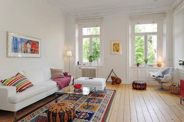 - viele Textilien, das die Bewohner kalter Länder wärmen und trösten soll. Versteck dich auf dem Boden, Wollteppiche, weiche Teppiche, Fußmatten, Servietten und Kissen - all dies wird den Innenraum mit der nötigen Stimmung füllen.