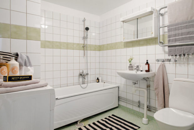 Die ideale Lösung für ein Badezimmer im skandinavischen Stil - dunkler Boden und helle Wände. Diese Technik bringt Klarheit und Prägnanz, erweitert den Raum visuell und ermöglicht es Ihnen, den Fokus auf die Installation zu verlagern. Für Wanddekoration tolle Passform fliesenverwenden Sie häufig eine Fliese, die einen Ziegelstein imitiert und eine glänzende Oberfläche hat. Eine beliebte Technik ist eine Kombination von Oberflächenmaterialien: Der untere Teil der Wände besteht aus Fliesen, der Rest ist bemalt. Land abseits der Wasserquelle kann vom Boden bis zur Decke gestrichen werden. Oft gibt es auch eine Variante, wenn mehrere Kacheloptionen kombiniert werden. Für Wanddekoration Stein und Mosaike sind ebenfalls geeignet und einige Bereiche können mit Holzvertäfelungen verziert werden.