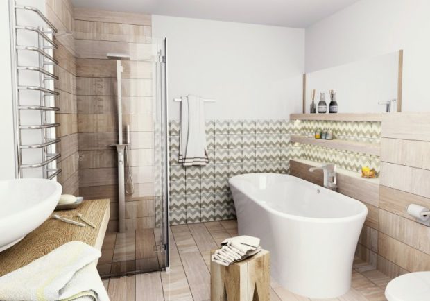Der Boden ist am besten mit Fliesen veredelt, da der Baum hier nicht viel zu leben riskiert. Ein Kompromiss ist Feinsteinzeug, das Holz imitiert. Sanitär hat eine prägnante Form, ohne Schnickschnack. Bevorzugt ist das einfachste Oval Badewannen und eine Seele mit Glastüren, weniger gebräuchliche Fußbäder. Möbel Sie können ein Holz oder Holzimitat nehmen.