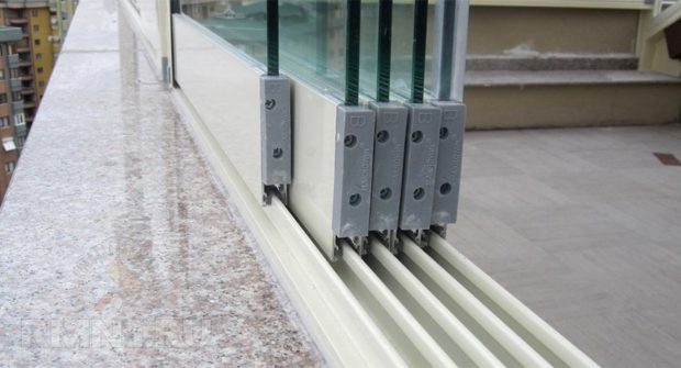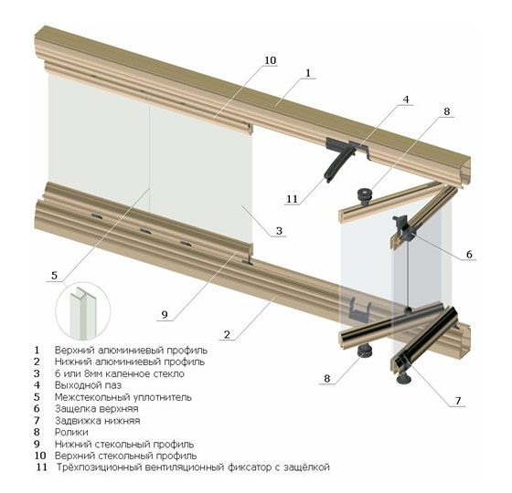 Das rahmenlose System ist einfach genug und ähnelt in vielerlei Hinsicht einem Design Kleiderschrank. Die Hauptlast fällt auf die oberen und / oder unteren Aluminiumrahmen (manchmal Stahlrahmen) mit Führungen. Das obere Profil wird an der Decke befestigt, das untere - am Boden oder an der Brüstung. Das Glas bewegt sich entlang der Führungen, und ihre Bewegung wird durch Räder auf Aluminiumplatten sichergestellt. Die Glasenden, die ohne Pads bleiben, werden geschliffen und so bearbeitet, dass sie im Betrieb so sicher wie möglich sind. Das Gewicht des Glases wird je nach Technologie entweder von der oberen oder unteren Führung oder von beiden Führungen gehalten.