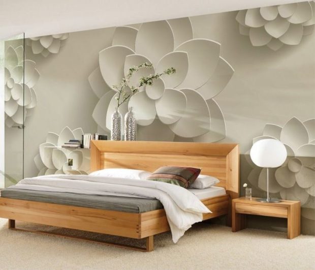- für das Schlafzimmer Bilder in ruhigen Tönen sind geeignet, Sie können Blumen, Abstraktion, See- oder Waldlandschaften, das Bild der Architektur wählen - alles, was die normale Ruhe nicht stört. Normalerweise schmücken Wandbilder die Wand hinter dem Kopf des Bettes, aber dies ist normalerweise nicht der Fall, es kann anders gemacht werden. Farbe angrenzende Wände Der Farbton sollte der Farbe der Fototapete entsprechen.