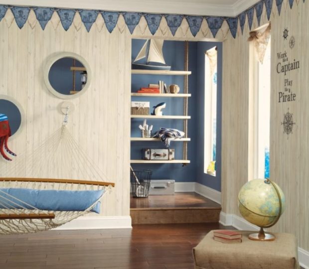 Es muy exitoso aplicar un borde con patrones en habitaciones espaciosasdonde se pone especial énfasis en las paredes. Frente a ellos, cualquier mueble puede estar completamente ausente. También esta opción es óptimo para decoracion niño habitaciones. Probablemente se haya encontrado con el hecho de que los padres solidarios intentan hacer que la vida de sus hijos sea lo más colorida y colorida posible y complacerlo en todos los sentidos. En este sentido, hacen la habitación dependiendo de las preferencias del niño. A menudo fondos de pantalla temáticos o foto papel tapiz con personajes de sus dibujos animados favoritos. El caso es costoso y no está completamente justificado. De hecho, a una edad temprana, el niño cambia muy a menudo y rápidamente sus pasatiempos. Hoy estaba encantado con los dinosaurios, y mañana se interesó en los aviones ... Por eso es mucho más fácil, más rápido y más económico reemplazar un borde con una imagen aburrida y ya irrelevante que volver a pegar el papel tapiz en toda la habitación.