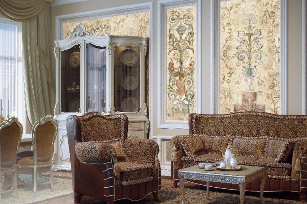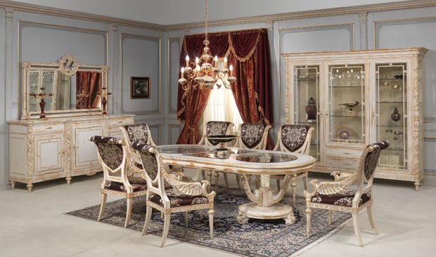 Sillas, mesas, aparadores y aparadores, sofás y sillones son aquellos elementos que necesariamente deben estar en el interior. Además, las sillas deben tener tapicería de tela. Muy a menudo es satinado o terciopelo. Definitivamente, la tela debe ser elegante y costosa y piernas curvadas talladas. La tabla debe tener la misma característica. Forma su preferencia redonda u ovalada dependiendo del propósito. Suelen hacer ovales mesas de comedory redondo diario.