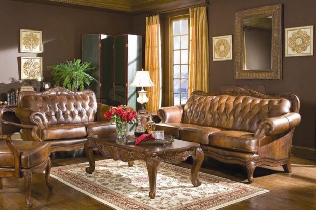 Derecho muy importante arreglar muebles. Debe elegir un elemento que sirva como centro imaginario y crear un entorno a su alrededor. Para un interior clásico, puede serchimenea. Por lo general, se coloca debajo de la pared más larga. Significa el sofa es necesario colocarlo frente a la chimenea, en ambos lados puede instalar un par sillonesy pon una mesa de café entre la chimenea y el sofá. Por lo tanto, cuando todos los muebles se giran en una dirección, queda claro de inmediato qué es lo más destacado de la habitación.