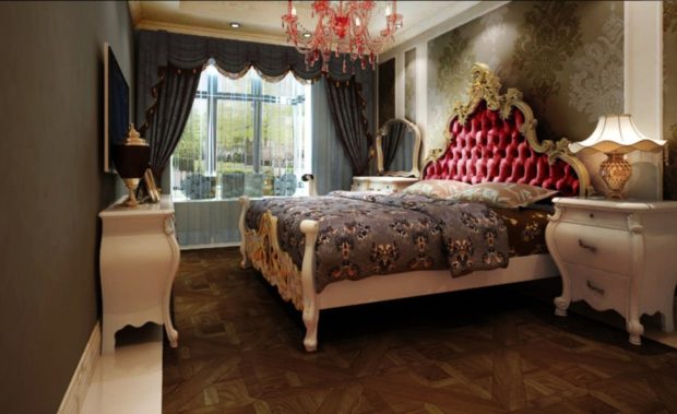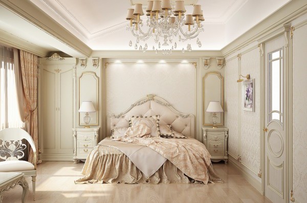 Los aparadores y aparadores pueden tener hermosos mangos de latón. Inserciones de vidrio obligatorias en las puertas de los aparadores. Para el baño de mujeres, puede usar el tocador de manera segura. Las piernas Los sillones y sofás, en primer lugar, deben ser, al menos bajos. Y, en segundo lugar, deben ser curvos. Quizás estos serán artículos falsificados. El tema central en el dormitorio será cama grande con cabecero de lujo o dosel.Este es el caso cuando no da miedo exagerar.