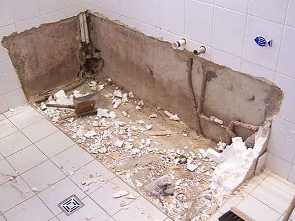 Primero debe sacar todos los muebles, interiores y artículos de decoración de la bañera, y luego continuar con el desmantelamiento. Esta es la etapa más sucia, polvorienta y ruidosa, sin la cual, desafortunadamente, es imposible de hacer. Todo comienza con desmantelamiento y eliminación de todo fontanería antigua. En esta etapa, ya es posible y necesario cerrar el suministro de agua y poner tapones en las tuberías de alcantarillado. Lo siguiente es necesario deshacerse de los elementos de lo viejo acabados: Primero, se limpia el techo del revestimiento antiguo, luego las paredes y, al mismo tiempo, se eliminan las tuberías viejas y luego se trasladan al piso. Los expertos aconsejan eliminar siempre el azulejo viejo para reducir el riesgo de hongos después de la reparación.