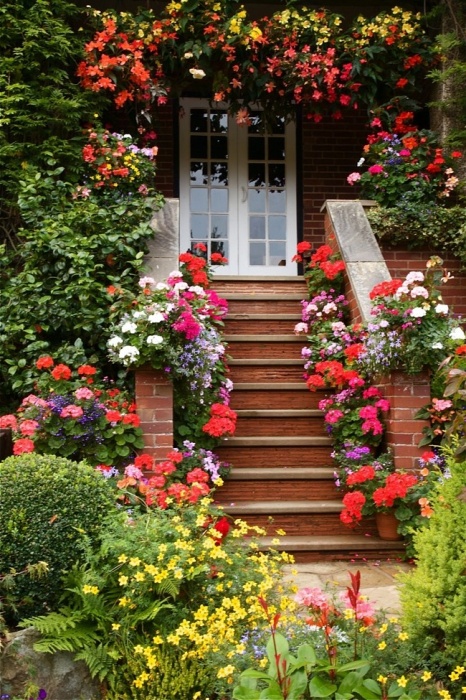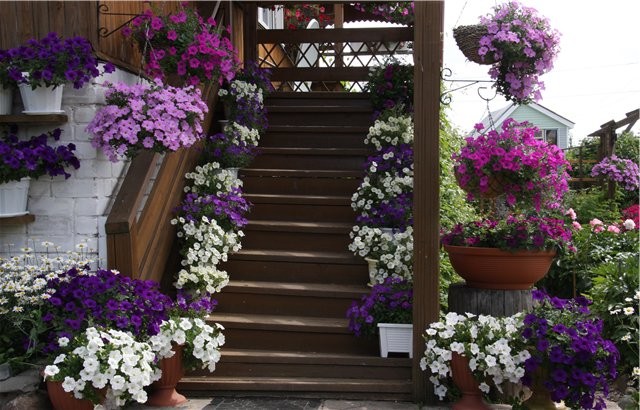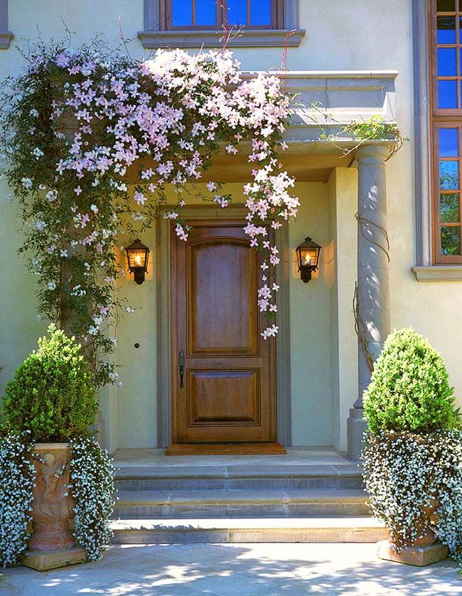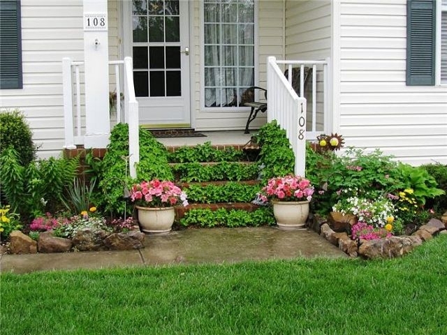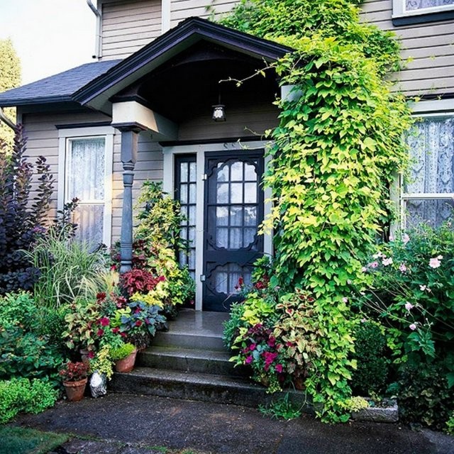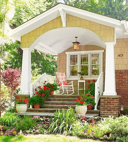 - las plantas - Una decoración universal que se combinará con madera, piedra y metal. En el porche puede poner flores en macetas, plantar plantas trepadoras que trenzarán la barandilla, construir macizos de flores a lo largo de las escaleras o usar macetas colgantes: hay muchas opciones. Es mejor elegir flores que florezcan durante toda la estación cálida. También puede usar flores secas, arbustos de hoja perenne e incluso flores artificiales, pero elija aquellas que parezcan prácticamente indistinguibles de las naturales;