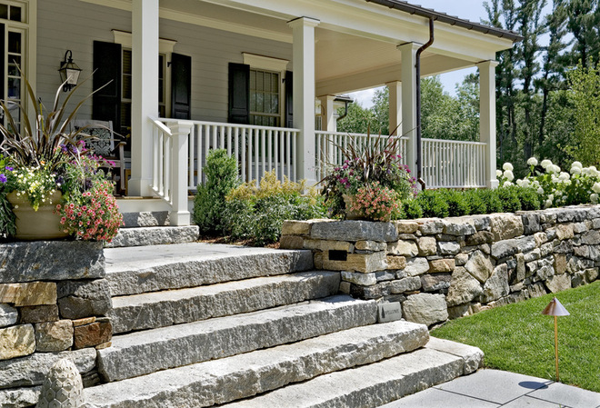 - piedra natural - Una forma costosa y elegante de decorar el porche. Hay muchas rocas, difieren en color y textura, pero todas son resistentes a cualquier clima e influencias mecánicas.Puede usar tanto piedra aserrada como azulejos o una tira de piedra. Muy a menudo, para enfrentar el porche, use arenisca, mármol y lamecitay granito considerada una de las opciones más caras y duraderas (tal porche le servirá durante al menos 100 años). Las rocas resbaladizas están sujetas a tratamiento térmico o grabado, pero si no desea "burlarse" de la piedra, puede comprar almohadillas de goma especiales. Otra opción interesante es piedra de escombroseso encajará en parcelas de estilo rústico;