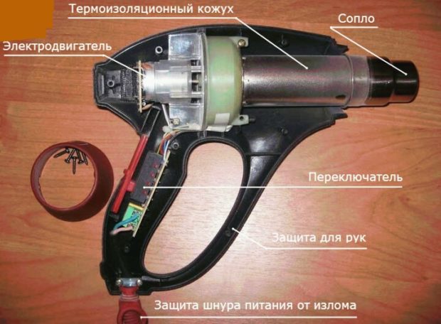 rakennus hiustenkuivaaja löysi sovelluksensa ihmisen elämän eri osa-alueille. Se on laite, joka toimii lämmitetty ilmavirta ja on suunniteltu kuumentamaan erilaisia materiaaleja suorittaessaan rakennus- ja asennustyöt. tärkeä ominaisuus Hiustenkuivaaja on sen kyky ohjata kuuman ilman virtaus tarkalleen haluttuun kohtaan. lämpötila lämmitetyn ilman virtaus saavuttaa 300-500 ° C, mutta on malleja, joiden lämpötilaolosuhteet ovat alhaisemmat, esimerkiksi 50 ° C. suunnittelu tämä laite on erittäin helppo. Kestävästä muovista valmistettuun koteloon asennetaan sähkömoottori, lämpöä eristävä kotelo ja lämmityselementti.