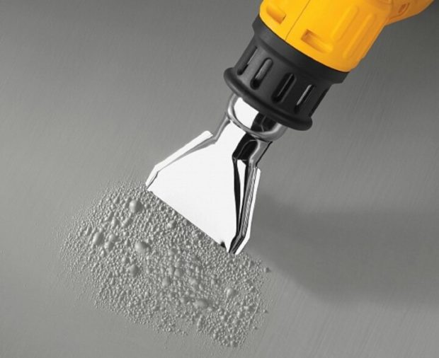 - Könnyedén eltávolítás réteg régi lakk, festékek, háttérkép és egyéb anyagok bármilyen felületről, speciális spatula-kaparóval. Forró levegő áramoltatása megolvasztja a régi bevonatot, és sokkal gyorsabban eltávolíthatja, mint más módszerekkel.