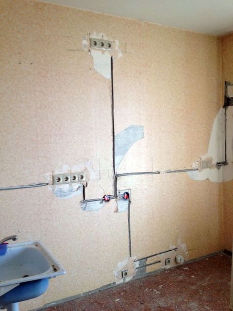 התקנת חוטי חשמל לבצע תוך התחשבות בכל נקודות צריכת החשמל, ציידו ושיפצו גם במידת הצורך, מערכת אינסטלציה וביוב. הם מתחילים בחיווט חשמל, לסידורם יש צורך בכבלים תלת-חוטיים בבידוד כפול בקוטר 2 מ"מ. קירות נחתכים במקומות הדרושים להנחת הכבל שם, ואז החוט עצמו מקובע בעזרת סרט מיסוך וטיח. הכבלים מונחים רק בזוויות ישרות. בשלב זה עליכם לדעת בבירור את מערך התאורה של המטבח ואת מיקום השקעים.