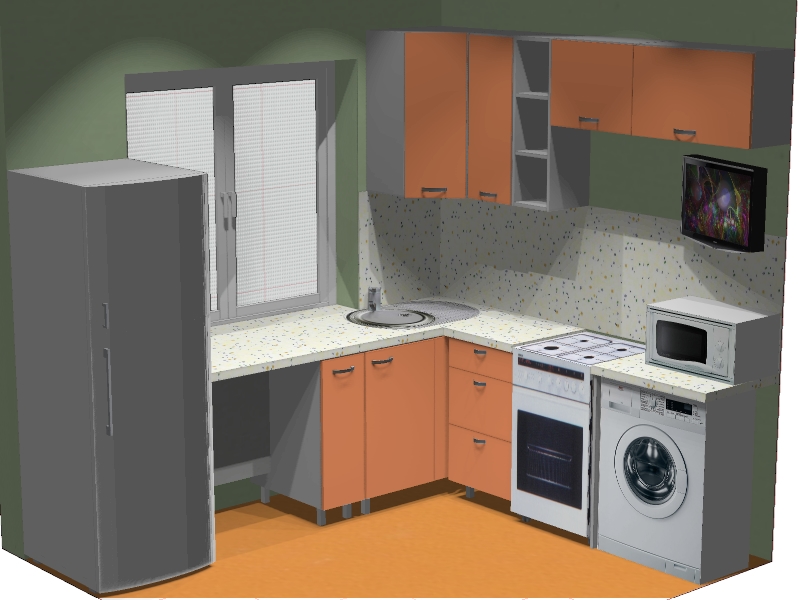 אם המטבח קטן, אז בשורה אחת כל הרהיטים עם המכשירים עשויים שלא להתאים. במקרה זה, עדיף להשתמש בסוג הפינה של מיקום הרהיטים. חשוב לקחת בחשבון את זה אורך כל צידי סביבת העבודה צריך להיות מגובה 3 עד 6 מטרים - אלה הם הערכים האופטימליים, כך שיש מספיק מקום, ותנועות רבות לא היו צריכות להיעשות בזמן הבישול. כמו כן, מומחים ממליצים כי המרחק בין צידי משולש המטבח (שטיפת מכוניות, תנור, מקרר) צריך להיות שווה בערך ולא יעלה על 1.85 מ '.