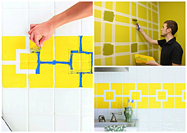 Vous pouvez peindre et carrelage dans la salle de bainpar exemple. Si la base est monotone, il y a plus qu'assez d'options pour un nouveau motif ou motif. Vous pouvez créer une exclusivité à la main ou utiliser un pochoir: trouvez le motif souhaité sur Internet, imprimez une image, faites un pochoir dessus et continuez.