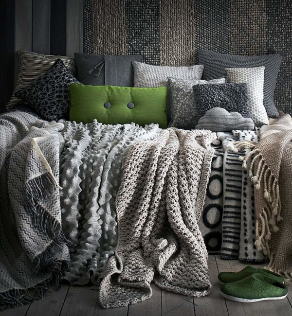 Les plaids en une seule couleur ou, au contraire, multicolores (selon les caractéristiques intérieures) aideront à rendre le logement plus confortable et intéressant. Utilisez le plaid une fois plié et déplié sur les chaises, canapéslits.