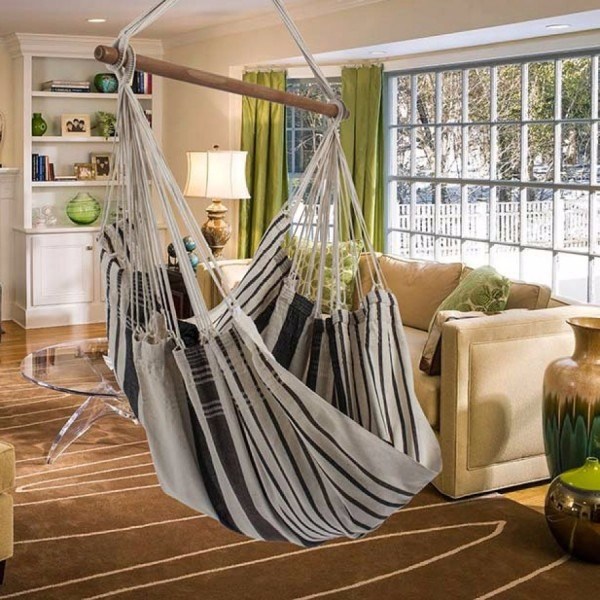 Un tel détail rendra la pièce inhabituelle et donnera à l'atmosphère de la chambre une légère nuance d'humeur de vacances. Regardez particulièrement impressionnant hamacs à proximité de grandes fenêtres lumineuses.