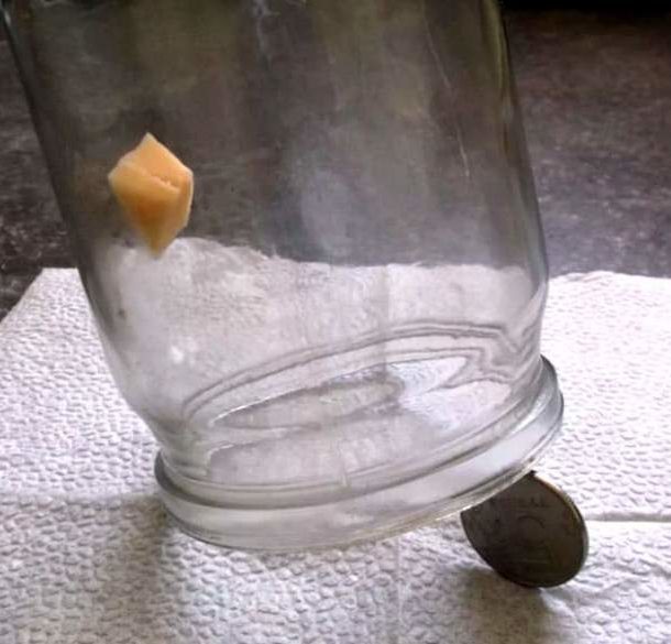 Pour organiser un piège, vous devez prendre un bocal en verre et une pièce de monnaie ou un morceau de carton avec un petit renfoncement. La boîte est retournée, une friandise pour l'animal est placée à l'intérieur, un bord de la boîte est soulevé et posé sur le bord de la pièce ou un morceau de carton placé verticalement. Tout doit être fait très soigneusement, car le design est très instable et il ne sera pas difficile de bouleverser l'équilibre même pour une petite souris, qui est immédiatement prise.