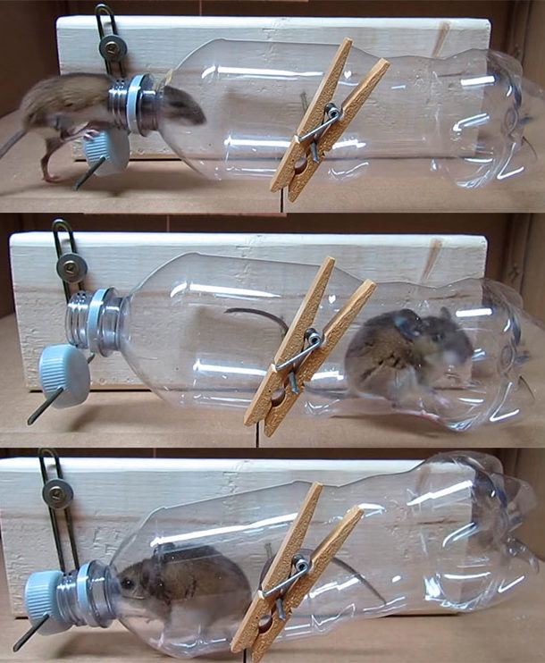 Le deuxième dispositif, contrairement au premier, concerne les méthodes humaines de se débarrasser des rongeurs. Les animaux capturés ne causent pas de dommages physiques et peuvent être relâchés dans la nature, autant que possible depuis leur domicile.