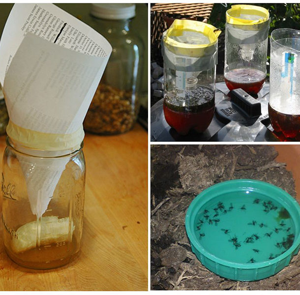 L'appât pour les moucherons agaçants peut être des liquides aigres ou sucrés: pomme et vinaigre de vin, vin, jus, bière, compote ou miel