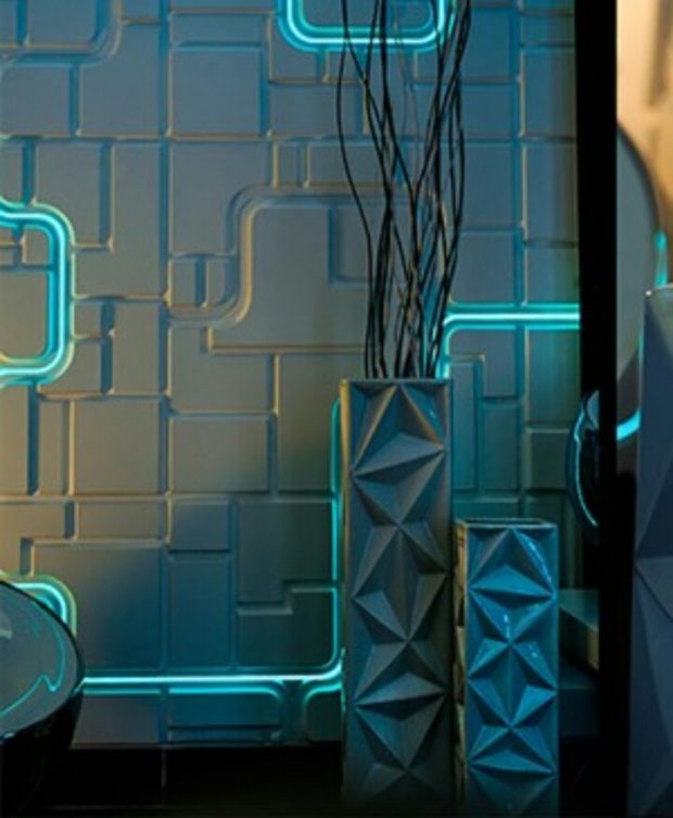 N'oubliez pas que il est important de choisir non seulement une forme appropriée, mais aussi couleur. Les couleurs claires conviennent bien au style classique et les couleurs sombres ajouteront du mystère à votre pièce. La finition avec des panneaux 3D semble très avantageuse, ce qui souligné à droite éclairage. Ne négligez pas cette règle, assurez-vous d'utiliser au moins une paire de projecteursvisant un tel mur. Les ombres qui créent des courbes sur la surface des panneaux ajouteront de la profondeur et du confort à la pièce. Dirige généralement la lumière le long du dessin, un tel agencement souligne le plus favorablement sa texture, de sorte que la source de lumière peut être située à la fois au-dessus et en dessous ou en dessous du côté du mur. L'angle d'incidence le plus optimal du flux lumineux est de 13 à 20 degrés. Plus récemment, la 3D a été mise en vente panneaux avec déjà intégré Rétroéclairage LED. Vous pouvez changer la couleur, et même l'intensité de l'éclairage, selon votre humeur à l'aide d'un petit panneau de commande. De tels panneaux sont bien sûr plus chers, mais l'effet est stupéfiant.