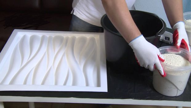 Du paragraphe précédent, il est clair que les panneaux 3D sont fabriqués moulage par injection. Vous pouvez acheter un formulaire avec le dessin nécessaire sur le marché ou le commander en ligne. Les formes ne sont pas seulement en plastique, mais aussi en silicone. Il est plus pratique d’en extraire les plaques finies, mais elles coûtent plus cher, donc pour une production unique, le plastique vous suffit. Ensuite, vous aurez besoin matériaux pour verser mélanges. Ils sont peu coûteux et vendus dans toutes les quincailleries. Vous aurez besoin de gypse, de fibres, de chaux et tête de forage sous forme de mélangeur pour mélanger le mélange. La fibre est un matériau de renforcement dont l'utilisation n'est pas nécessaire, mais préférable.