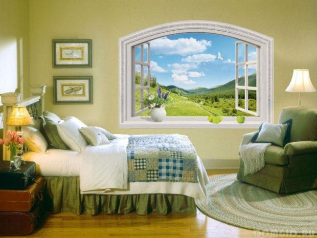 - Dans la chambre il faut aménager des fenêtres avec des fenêtres plus calmes, images attrayantes qui détendra et syntonisera pour se reposer. Par exemple, des paysages discrets sans cascades orageuses et pentes de pierre. Les meilleures images sont celles qui représentent un coucher de soleil sur la mer ou une aube tôt le matin. Ne pas avoir de fenêtre à proximité tête de litil vaut mieux l'équiper sur le mur d'en face pour pouvoir l'admirer avant d'aller se coucher. Fenêtres de plafond avec l'image du ciel étoilé rendra la pièce plus confortable et romantique.