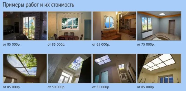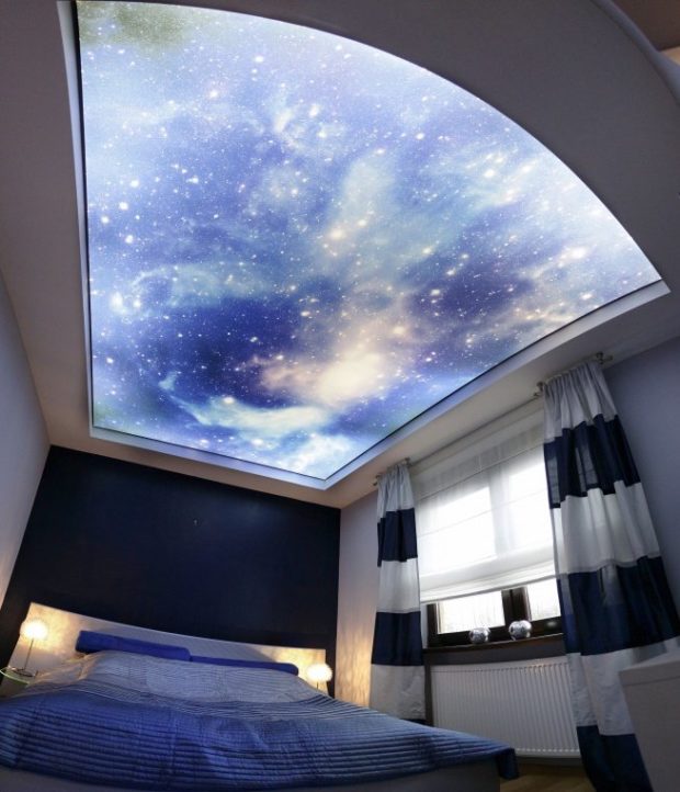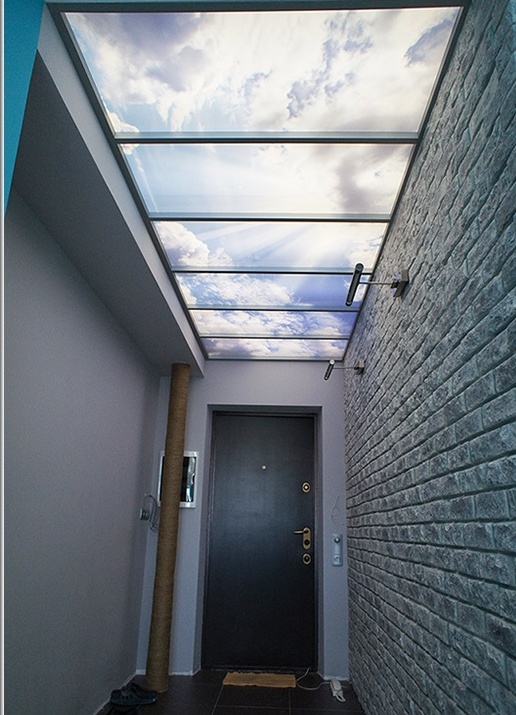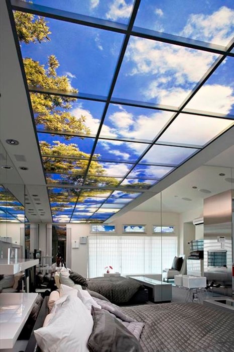- Avant-dernier la place prend plafond une fenêtre. Son coût élevé est dû aux caractéristiques de son agencement. Maintenant, nous ne parlons pas d'une feuille de papier peint photo collée au plafond. Nous voulons dire plein niche de plafond avec rétro-éclairage, image réaliste et beau design, qui forme un seul plan avec la surface principale du plafond. Pour faire une telle conception, vous devez d'abord construire une boîte de cloison sèche de la taille appropriée. Fixez-y les appareils d'éclairage, puis collez l'image sur le plexiglas et fixez-la sur les murs de la boîte. Maintenant, vous devez faire un seul niveau. Vous pouvez coudre davantage le plafond avec des cloisons sèches, mais vous pouvez utiliser plafond tendu. Il vaut mieux confier un travail aussi difficile à des professionnels, pour lesquels il faut aussi payer. Coût par mètre carré Le plafond tendu commence à 10 $. Dépend de la qualité du film et de la situation géographique. N'oubliez pas d'ajouter le coût des cloisons sèches, des profils, des lumières, des images et du verre. Nous concluons que ce n'est pas entièrement bon marché, mais très impressionnant.