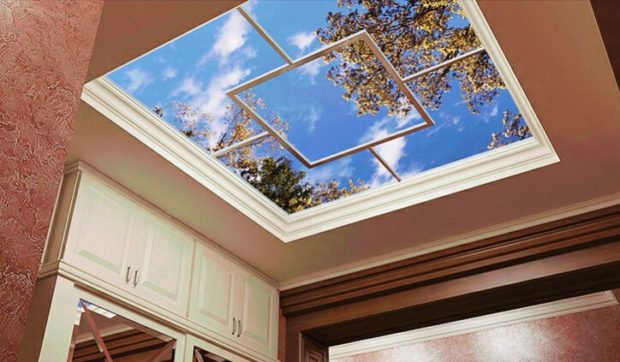 - Avant-dernier la place prend plafond une fenêtre. Son coût élevé est dû aux caractéristiques de son agencement. Maintenant, nous ne parlons pas d'une feuille de papier peint photo collée au plafond. Nous voulons dire plein niche de plafond avec rétro-éclairage, image réaliste et beau design, qui forme un seul plan avec la surface principale du plafond. Pour faire une telle conception, vous devez d'abord construire une boîte de cloison sèche de la taille appropriée. Fixez-y les appareils d'éclairage, puis collez l'image sur le plexiglas et fixez-la sur les murs de la boîte. Maintenant, vous devez faire un seul niveau. Vous pouvez coudre davantage le plafond avec des cloisons sèches, mais vous pouvez utiliser plafond tendu. Il vaut mieux confier un travail aussi difficile à des professionnels, pour lesquels il faut aussi payer. Coût par mètre carré Le plafond tendu commence à 10 $. Dépend de la qualité du film et de la situation géographique. N'oubliez pas d'ajouter le coût des cloisons sèches, des profils, des lumières, des images et du verre. Nous concluons que ce n'est pas entièrement bon marché, mais très impressionnant.
