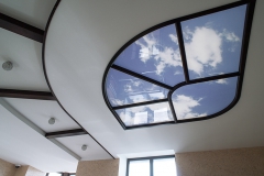 - Fenêtre de plafond - l'une des techniques les plus préférées utilisées pour le visuel augmenter la hauteur de la pièce. Meilleur fond pour lui il y aura une fresque montrant le ciel avec la cime des arbres ou le ciel nocturne avec une dispersion de constellations. Pour de tels éléments, il est souhaitable utiliser le rétro-éclairage alors une sensation d'espace et de ciel ouvert au-dessus de votre tête sera créée. Vous pouvez le faire sans rétro-éclairage, mais l'image elle-même est préférable de choisir une lumière remplie de soleil. En frange, les moulures de plafond ou les coins légers en polyuréthane sont parfaits. Très cool, ces éléments complètent les arches douces des pièces mansardées, où le plafond crée une sensation oppressante et oppressante. Ils ne sont inférieurs à rien fenêtres de mat plaine verre.