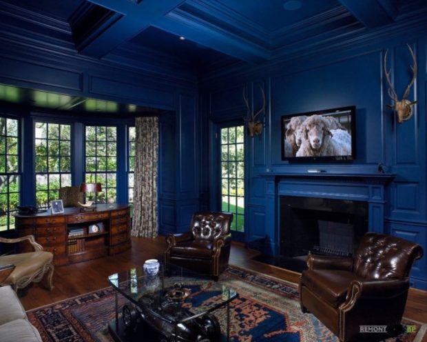 Dans cette salle, vous pouvez déjà vous permettre des options plus intéressantes utilisez des nuances bleues. Même avec les dépenses les plus modestes en articles de décoration, vous pouvez le faire l'intérieur très dynamique et moderne. Bleu saturé avec surfaces en bois foncé. Et pour donner du contraste et séparer les murs et le sol, utilisez du blanc plinthe large. Un tel élément a besoin de soutien, et donc vantaux de porteet les plateaux doivent également être blancs. Et comme accent, vous pouvez utiliser des lampadaires avec des abat-jour nuances rouges, violettes ou vertes.