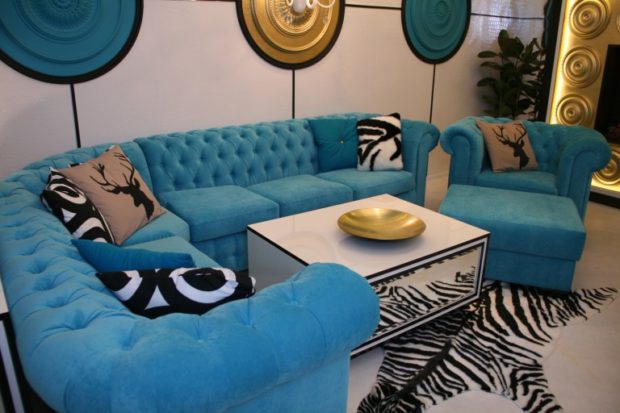 N'oubliez pas que le bleu peut être non seulement des surfaces familières, mais meubles rembourrés. Luxueux bleu le canapé, qui prendra sa place d'honneur contre un mur léger, zeste toute la pièce. Les oreillers peuvent être de n'importe quelle couleur, mais il vaut mieux avoir quelque chose en commun avec couleur du rideau ou d'autres éléments décoratifs. Bleu marine moquette combiné avec des murs plus légers créera une atmosphère confortable et légèrement mystérieuse. Et si votre salon pénètre doucement dans le hall et a des dimensions impressionnantes, vous pouvez utiliser des meubles aux couleurs chocolat noir. Un tel intérieur a l'air très noble et solide.