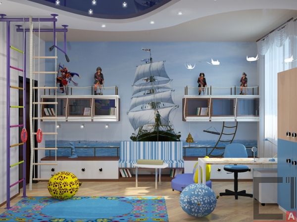 Si vous aimez des options plus inhabituelles, par exemple, vous voulez lit bleu ou tout autre meuble, alors souvenez-vous que peint en bleu, ils sembler plus grand et plus lourd. Et bien sûr, l'intérieur de la pépinière dans le style marin que beaucoup de gens adorent est tout simplement inconcevable sans l'utilisation de cette couleur. Composition complète cela est possible en représentant un bateau sur l'un des murs et en le décorant de vraies voiles ou d'une bouée de sauvetage. Et à côté du lit, vous pouvez imiter la prise de la cabine. Le petit capitaine sera ravi d'une telle salle.