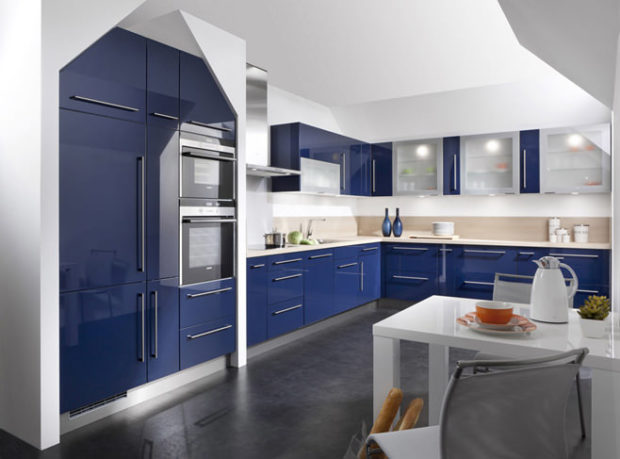 L'utilisation du bleu à l'intérieur de la cuisine de manière positive affecte sur santé personne. Cette théorie a été prouvée. scientifiques de nombreux pays. Le fait est que l'intérieur de la salle à manger bleue favorise un appétit modéré et réduit les envies de sucreries. Par conséquent, si vous voulez commencer à bien manger, mais que vous ne pouvez pas vous passer d'au moins un peu de bonbons tous les jours, alors c'est votre option. Look très intéressant et moderne bleu mat façades en combinaison avec des poignées en aluminium et du verre translucide. Ajoutez du gris à la composition. plan de travail et les appareils ménagers avec des éléments en acier inoxydable, et intérieur de cuisine tendance prêt! Certes, cette pièce sera un peu froide.